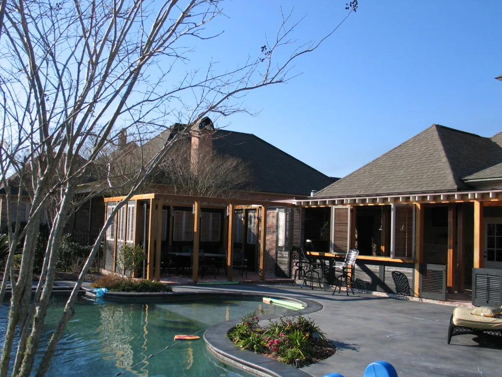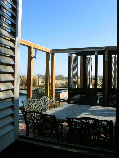 Living outdoors in Louisiana can occur almost all year round. Contrary to popular belief that the heat and humidity is unbearable, with environmentally astute solutions, the outdoors can be enjoyed more often than less. The Greene Pool House deals directly with this negotiation. The project site is the undefined area between a house and a pool in a planned development. Although the house and pool were designed, they were designed independently from each other, and the new project is to negotiate the residual space between. The programs for this negotiation includes a wet bathroom, bar, outdoor kitchen and living room, dining area, and landscape. The negotiation also must act as a safety boundary between the community golf course and the pool and the client’s children and the pool. The resolution for this project becomes a highly adaptable screen. This screen, made almost entirely from Spanish cedar shutters, sometimes is the gate, the fence, the room, the door, or even the wall. It can be partially open, fully open, fully closed, and locked. It can be transparent and it can be opaque. The shutter screen defines all parts of the new program, adapting for each, while retaining a consistency amongst all the parts and the existing site. Simultaneously, as the shutter screen resolves the myriad of programmatic and site issues, it acts as a negotiation tool with the exterior environment, creating an outdoor living environment where the clients’ can truly live.