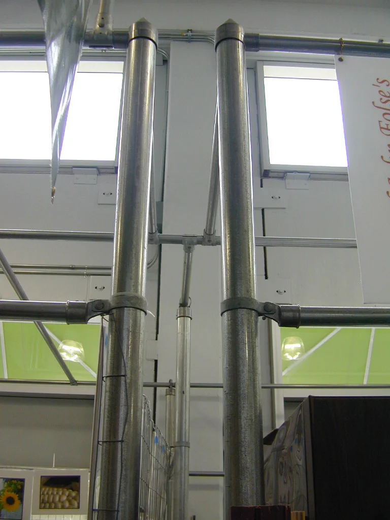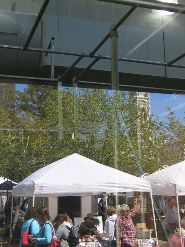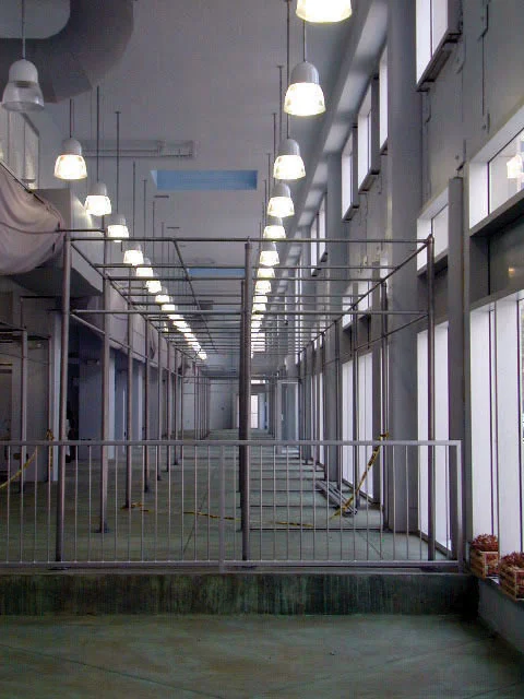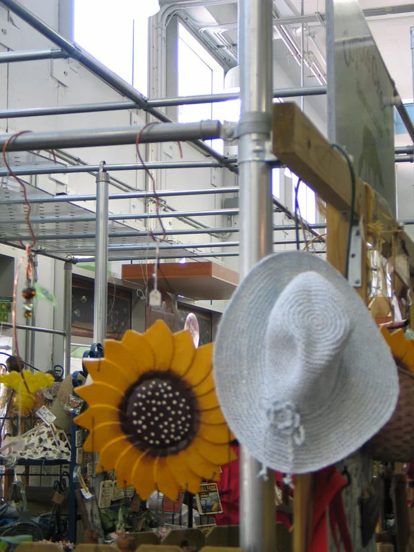The interior finishes reflect the exterior environment: the floors are mottled green and the walls and ceilings are sky blue with a bright blue trim. These colors reflect the light from the windows and skylights bringing the outside into the shallow section of the market. All fixtures including the booth system are galvanized metal and their reflective quality disappears in the natural light. The booth systems are composed of standard fencing components. They are designed so one person can adjust them. The multiple bars of the frame are arranged to provide multiple signage and storage opportunities. The frame is also constructed with a minimum presence so that each vendor may design their space as they wish.